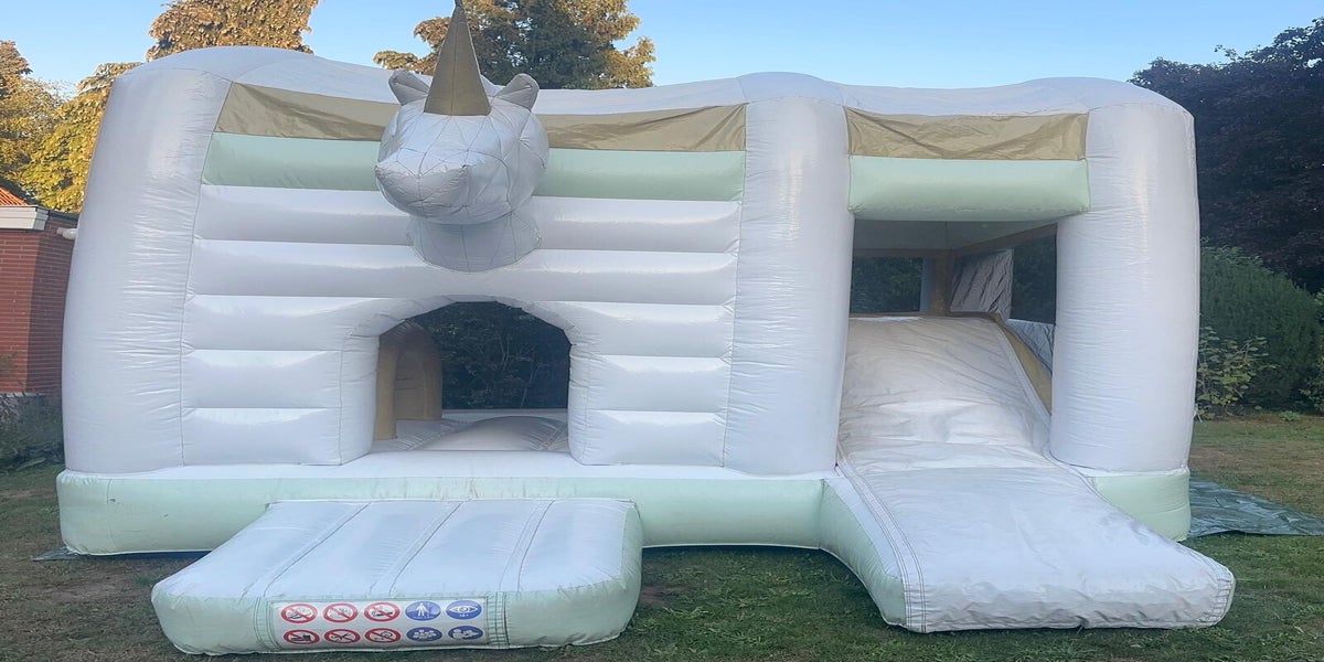 Met zijn witte kleur en eenhoorn-design straalt dit springkasteel pure vrolijkheid uit. Kinderen kunnen niet alleen springen en spelen, maar ook genieten van de glijbaan voor extra plezier.